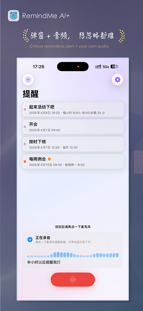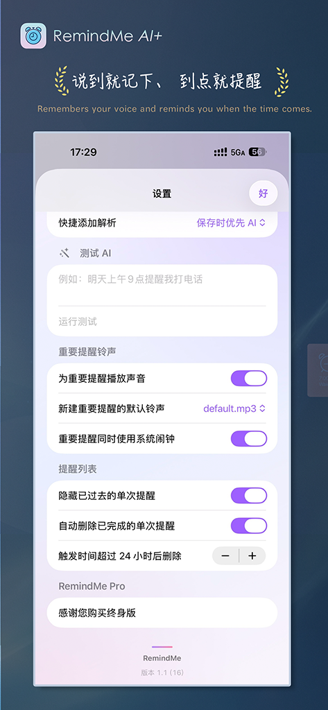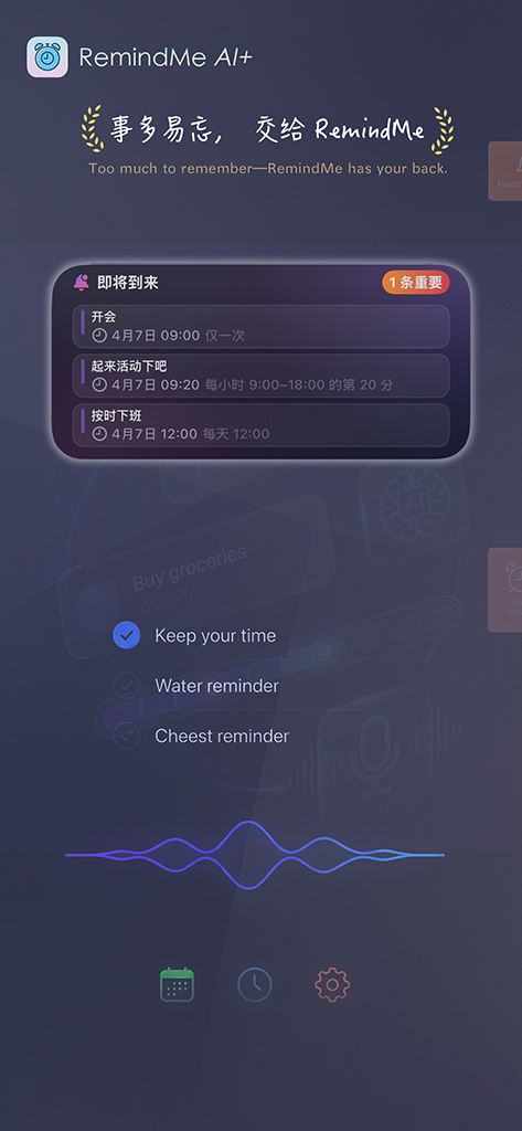 Lite: core reminders and Quick Add. Premium: one-time unlock for sync, critical alerts, and AI parsing. Details in the app.