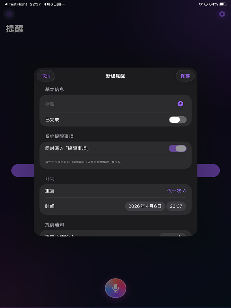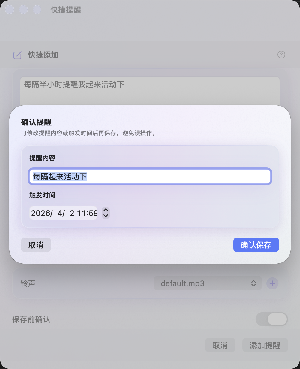 Write when, what kind of reminder, and what to tell yourself—in rich Chinese or English phrasing. In-app help lists examples and full rules.