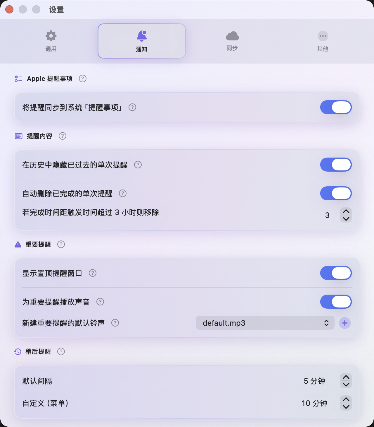 Optional mirror to Apple Reminders. Premium syncs data and preferences across Mac, iPhone, and Apple Watch via iCloud.